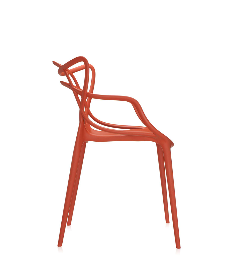 The Masters chair is a powerful tribute to the three symbolic chairs, re-read and re-interpreted by the creative genius of Starck. The "Series 7" by Arne Jacobsen, the "Tulip Armchair" by Eero Saarinen and the "Eiffel Chair" by Charles Eames interweave their unmistakable silhouettes into a sinuous hybrid giving life to a fusion of original and engaging styles. On its four slim legs, the Masters chair is roomy and comfy. The special finish on the chair makes it feel sensual and velvety to the touch. The back of the chair is naturally its most distinctive feature, characterised by the fullness and empty spaces created by the curvaceous criss-crossing lines of three different backs which descend to meet at the seat edge. The Masters is light, practical, comes in various colours and can be stacked and used outdoors as well. The Masters chair was honoured with the prestigious "2010 Good Design Award" presented by the Chicago Athenaeum - Museum of Architecture and Design and the Red Dot Design Award in 2013.