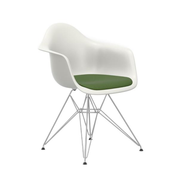 VITRA Eames Plastic Armchair full padding DAR NEW DIMENSIONS (White, cushion leaf green/ forest - Polypropylene white , chromed steel and Hopsak fabric)