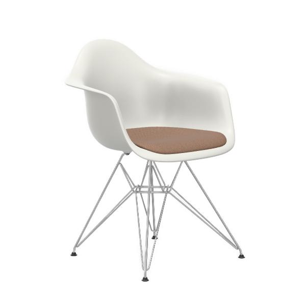 VITRA Eames Plastic Armchair full padding DAR NEW DIMENSIONS (White, cushion cognac/ivory - Polypropylene white , chromed steel and Hopsak fabric)