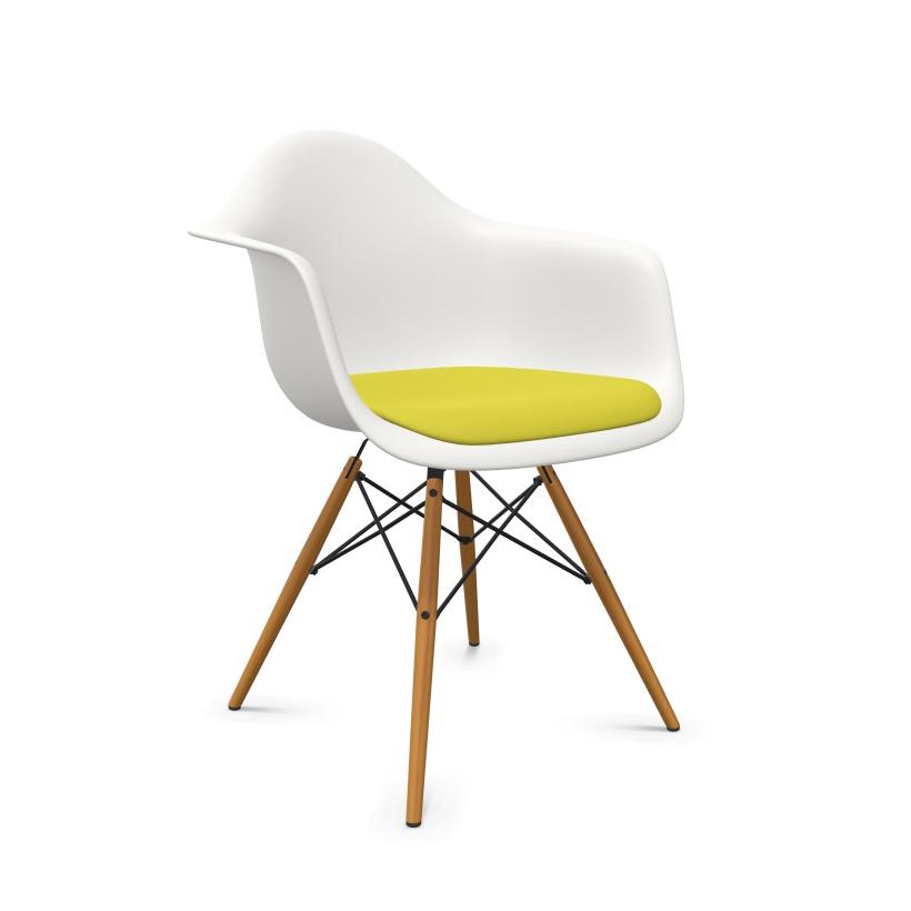 VITRA Eames Plastic Armchair with cushion and golden maple base DAW NEW DIMENSIONS (White, cushion yellow/pastel green - Polypropylene, wood and Hopsak fabric)