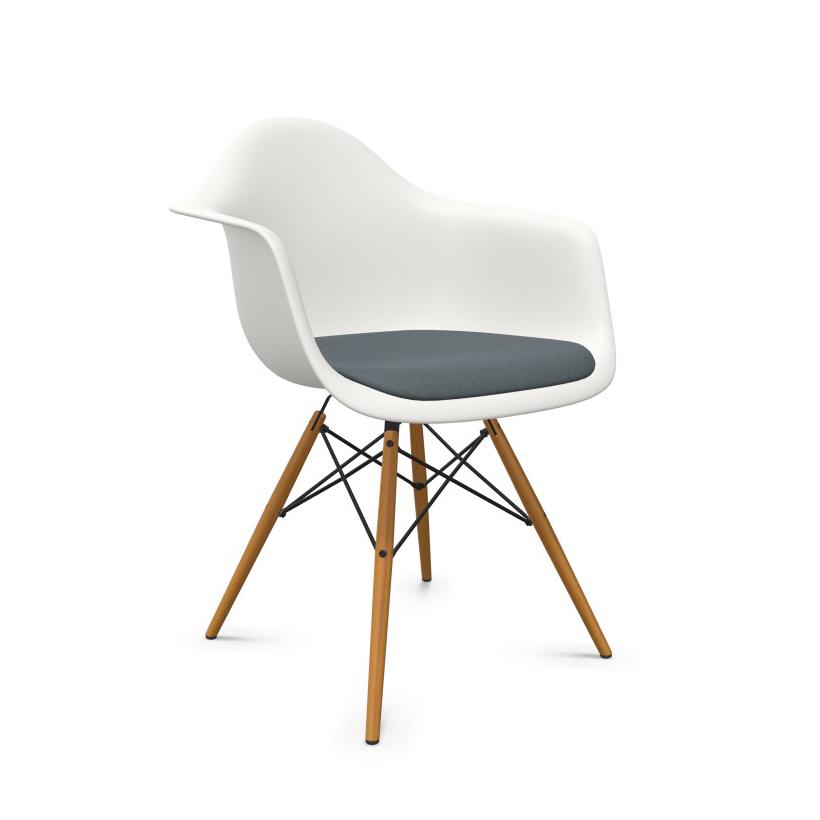 VITRA Eames Plastic Armchair with cushion and golden maple base DAW NEW DIMENSIONS (White, cushion blue ice/swamp brown - Polypropylene, wood and Hopsak fabric)
