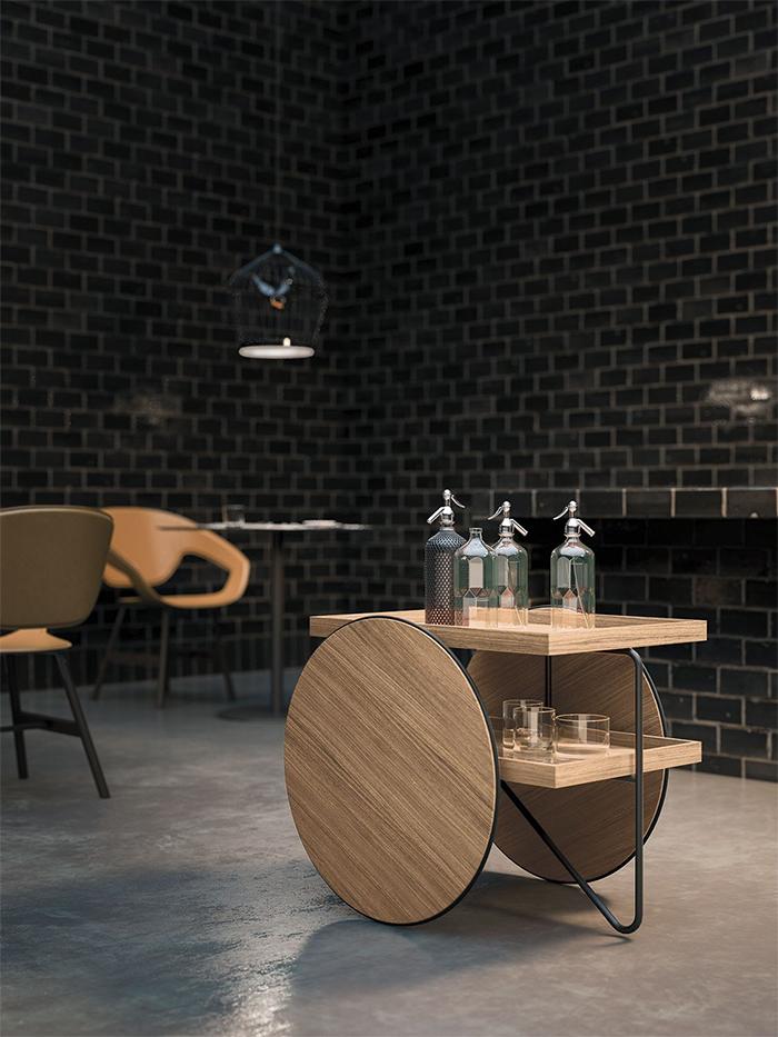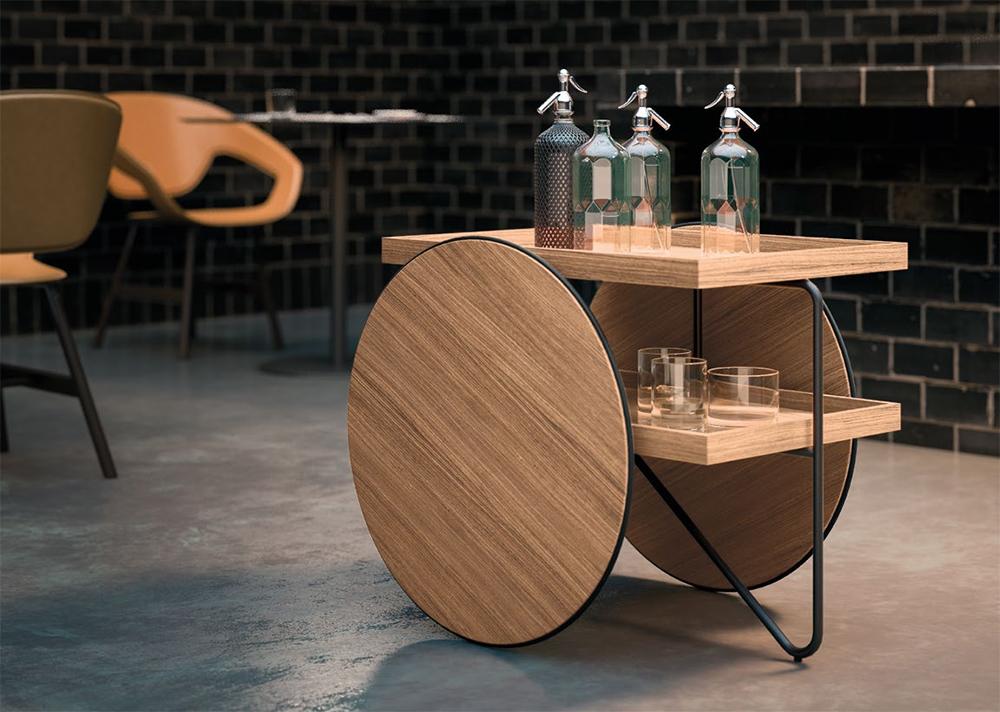 Chariot is a mobile table consisting of three simple elements joined together: wheels, trays and structure. The wheels, which in common carts are usually small, are brought to the extreme size, becoming the iconic element of the project. The rubber profile is inserted into the wheels for easy movement; the two trays act as storage compartments, the metal structure is also a handle: slightly raising the cart, it can be moved. The mobile side/board is packed in a wooden crate.