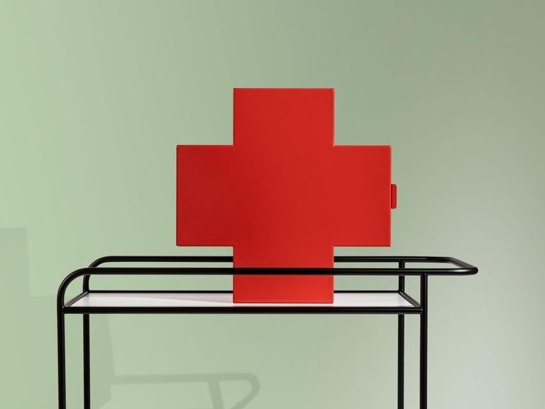 Designed to store medicine, the Cross Cappellini cabinet by Thomas Eriksson is wall-hanging, available with a glossy varnished finish, in red, orange, green, blue and white. Made of laser-cut and folded sheet metal, the doors of the Cross cabinets fasten with a magnet.