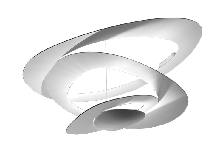 Pirce Artemide ceiling lamp in painted aluminium. Opening out of a slim disk are fluttering spirals, which fall gently downwards, creating magical effects of form and light. Integrated LED: 2700K, 44W, 3097lm, CRI=90 dimmable (PUSH).