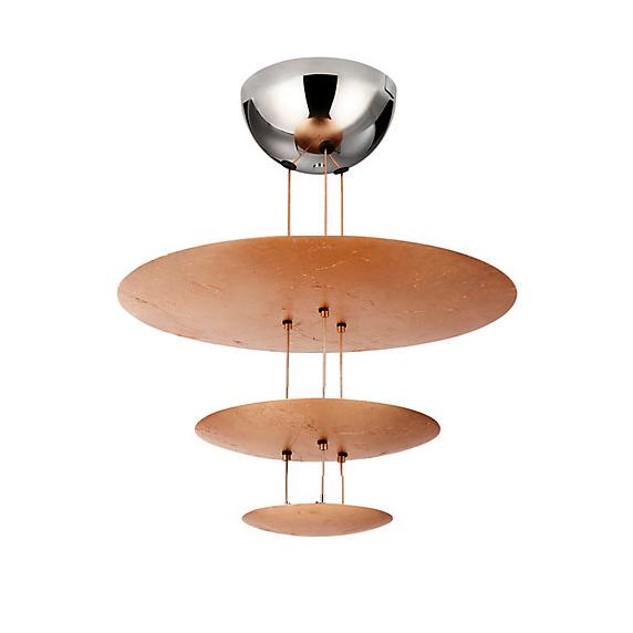 Macchina della Luce Catellani & Smith emerged from the Luci d’Oro collection, and was also developed after reflecting on the colour of light: the golden light of the sun and fire; warm light, in which the concept of refraction began to take shape in Enzo Catellani’s mind and which he used later in other creations. Diffuser discs lined with leaf (disc Ø 120 cm with flying leaf), brass or aluminium rods, nickel base. LED board 24V DC / 4x6W / energy class F / lumen 2660 / K 2700 / CRI 80. Low voltage driver 24V DC 220-240V dimmable Triac (dimmable 1-10V or DALI version available on request). Base Ø 21×10,5 H cm. Rods H 145 cm variable (on request 300 cm). Discs Ø 50-30-18 cm. Weight 6 kg.