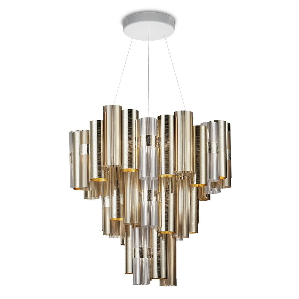 La Lollo Slamp animates space with elegance and spontaneity, awakening memories of a past full of celebrity divas and limelight with its shape and chromes. LED illuminated cylinders in La Lollo Slamp are arranged at different heights around a central ring and alternate shades of precious metals in pastel colours with transparencies. The brushing of the metallisation leaves to the light the task of creating the suggested decorum. Bulbs included LED 130W - 100~240Vac / 24Vdc 15.000 Lumen - 2700 Kelvin (warm white) CRI > 90. Dimmable with: PWM, 0-10 or Potentiometer. Dimmer DALI, BLUETOOTH, CASAMBI, TRIAC on request.