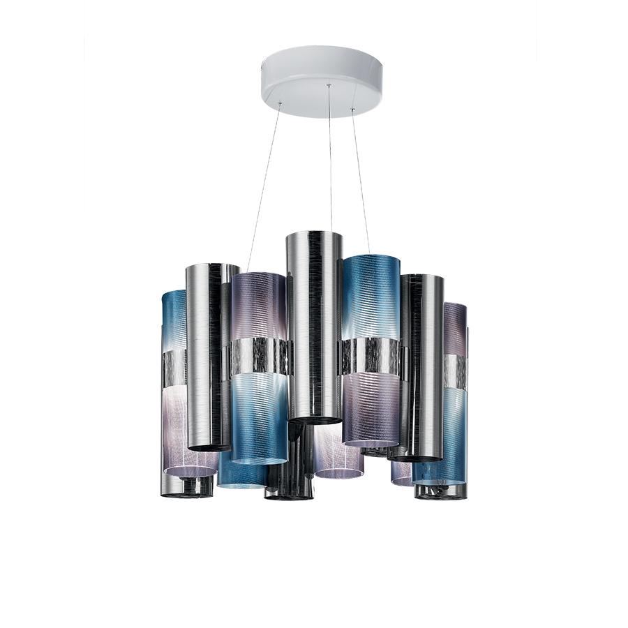 La Lollo Slamp animates space with elegance and spontaneity, awakening memories of a past full of celebrity divas and limelight with its shape and chromes. LED illuminated cylinders in La Lollo Slamp are arranged at different heights around a central ring and alternate shades of precious metals in pastel colours with transparencies. The brushing of the metallisation leaves to the light the task of creating the suggested decorum. Bulb included LED 40W - 100~240Vac / 24Vdc 4.600 Lumen - 2700 Kelvin (warm white) CRI > 90. Dimmable with: PWM, 0-10 or Potentiometer. Dimmer DALI, BLUETOOTH, CASAMBI, TRIAC on request.