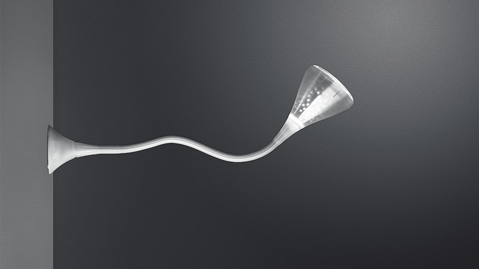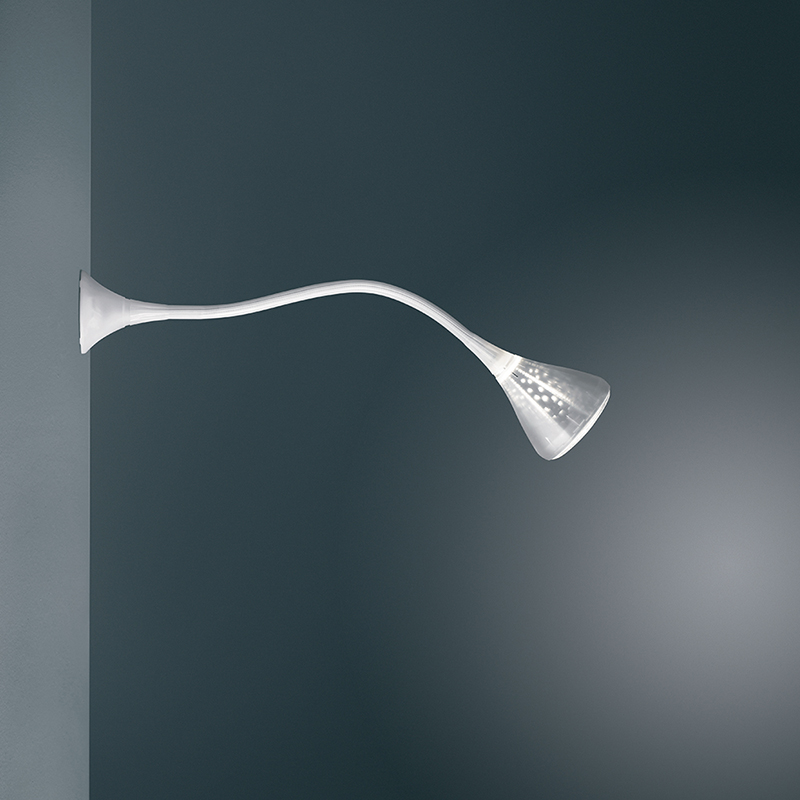 ARTEMIDE PIPE WALL/CEILING has a flexible painted steel structure, covered with a natural anti-yellowing silicone case; wall attachment and diffuser in transparent rubber-effect painted polycarbonate; mirror aluminium reflector with random perforations; painted steel bottom plate.The new internal diffuser is reinterpreting the old fluorescent lamp using a modern LED source, this guarantees the same optical performance with less power consumption and a better quality of light. Flexible and adjustable.