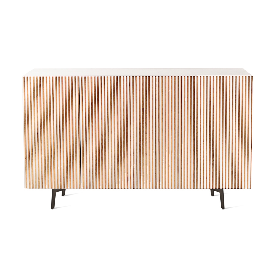Leon Horm is a sideboard that plays with an awe-provoking optical effect that underlies its salient feature, that is, a standpoint-dependent visualization. From the front, the doors appear marked by vertical multi-coloured stripes yet, when observed from the side, dark or light uniformity prevails. Even the unique lacquered white finish produces the same effects through room lighting.