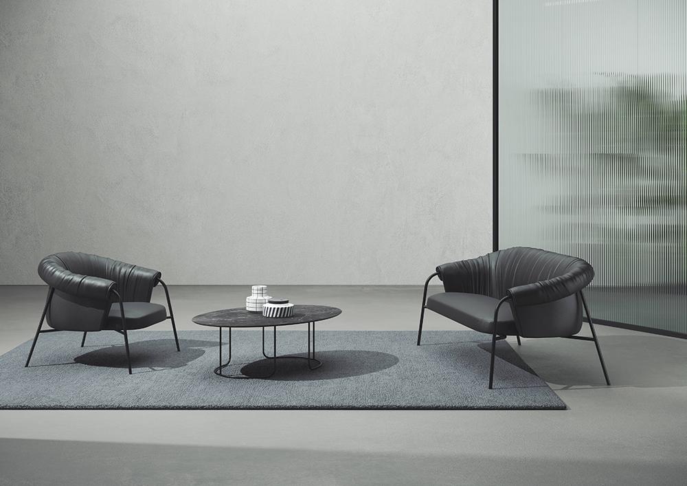 The Scala Alma Design collection is a tribute to Milan, a city of culture and history, fashion and design capital. The armchair, with its generous and enveloping shapes, is characterised by the pleating of the upholstery, an handcrafted work inspired by tailoring with an haute-couture effect. The upholstered seat and backrest are supported by a light metal frame, also echoed in the base of the coffee tables that complete the collection.