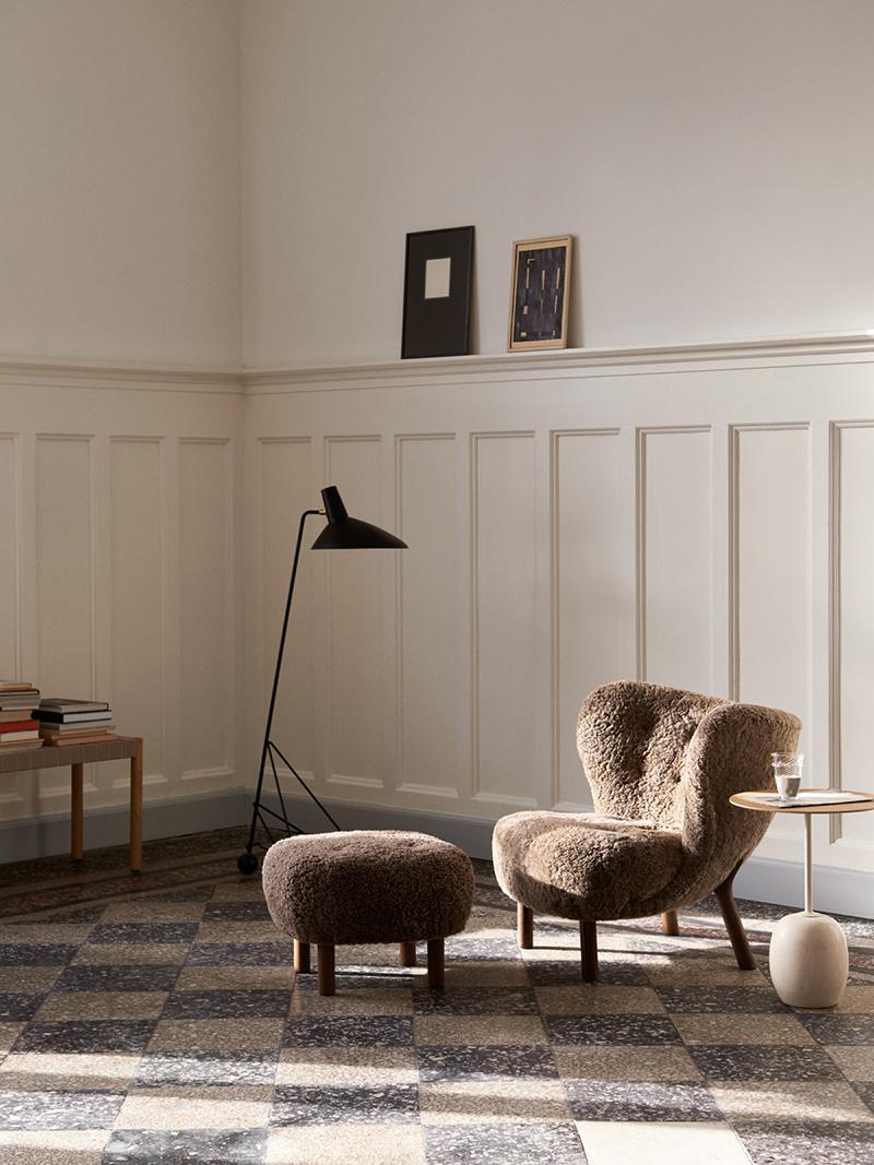 &TRADITION armchair and pouf LITTLE PETRA VB1 & ATD1 (Sheepskin, 17mm Sahara, walnut base - Fabric and wood)