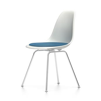 VITRA chaise avec coussin Eames Plastic Side Chair DSX NOUVELLES DIMENSIONS (Blanc, coussin bleu/marron marécage - Polypropylene blanc, acier chromé et tissu Hopsak)