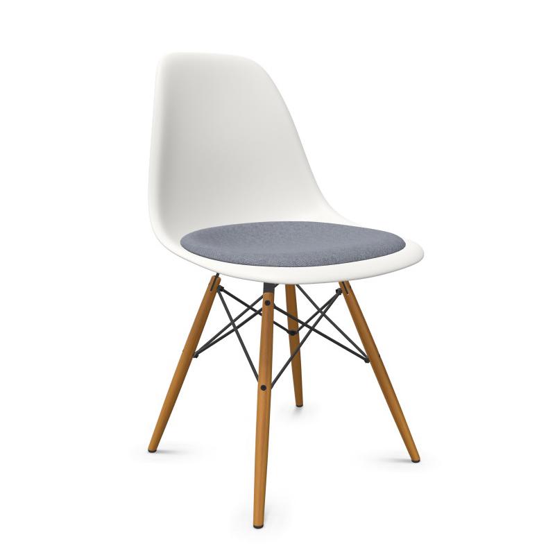 VITRA chaise avec coussin et base en érable doré Eames Plastic Side Chair DSW NOUVELLES DIMENSIONS (Blanc, coussin bleu foncé/ ivoire - Polypropylène, bois et tissu Hopsak)
