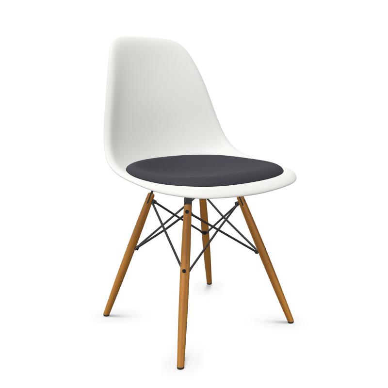 VITRA chaise avec coussin et base en érable doré Eames Plastic Side Chair DSW NOUVELLES DIMENSIONS (Blanc, coussin bleu foncé/ marron marécage - Polypropylène, bois et tissu Hopsak)
