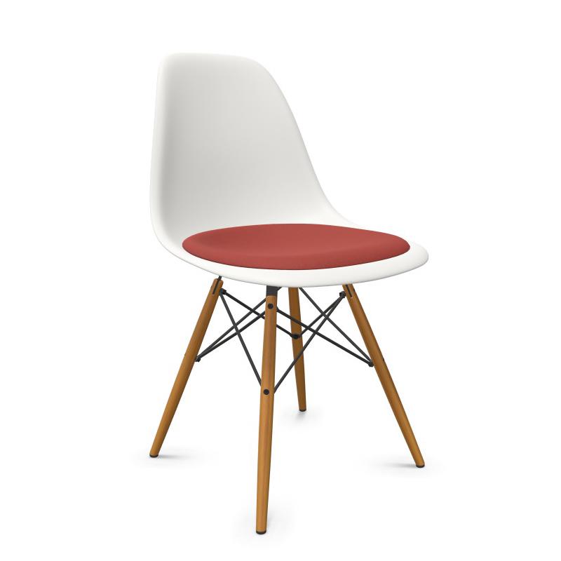 VITRA chaise avec coussin et base en érable doré Eames Plastic Side Chair DSW NOUVELLES DIMENSIONS (Blanc, coussin rouge/cognac - Polypropylène, bois et tissu Hopsak)
