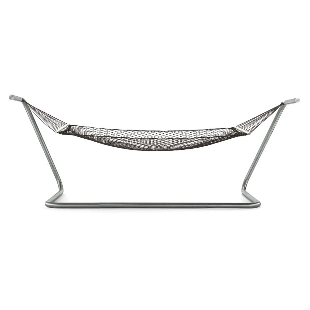 Hamac en corde de nylon noir. Structure en acier inox satiné.
