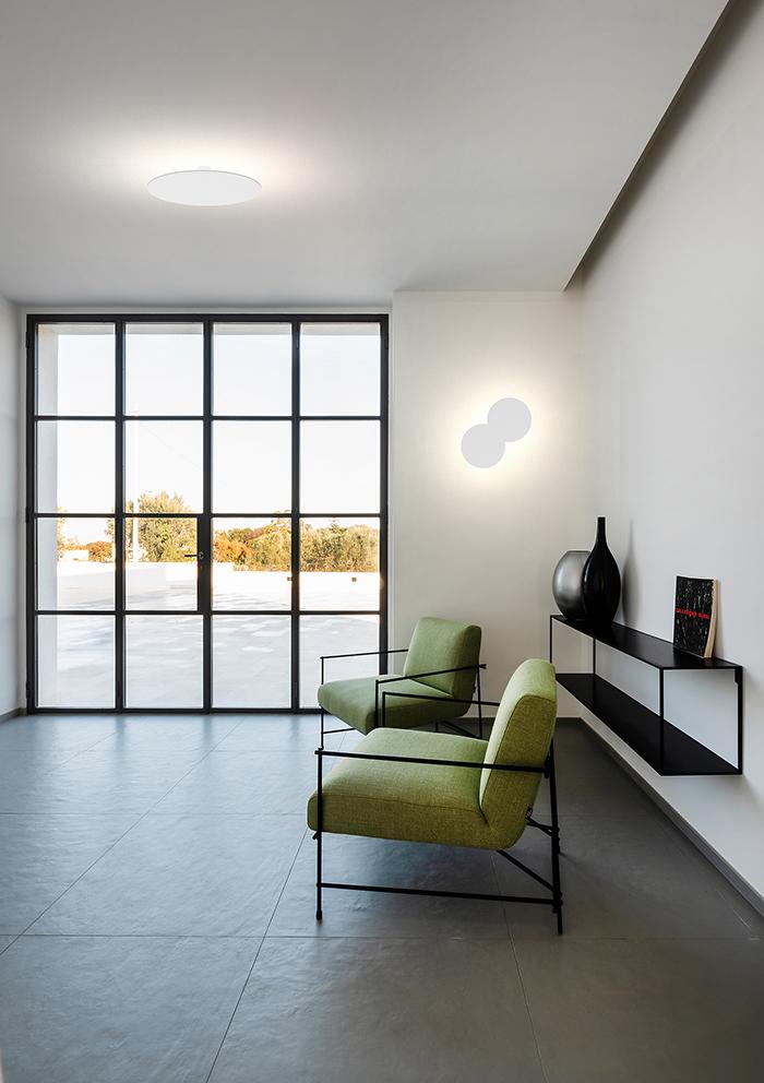 Entièrement en aluminium, Collide Rotaliana présente une émission de lumière indirecte et peut être utilisée aussi bien au plafond que sur le mur. Sa forme représente un prolongement naturel des sources lumineuses utilisées : un, deux ou trois circuits LED circulaires à la tension du réseau, 34W 3400lm CRI 90.