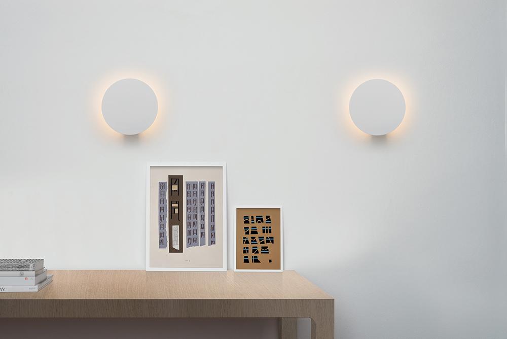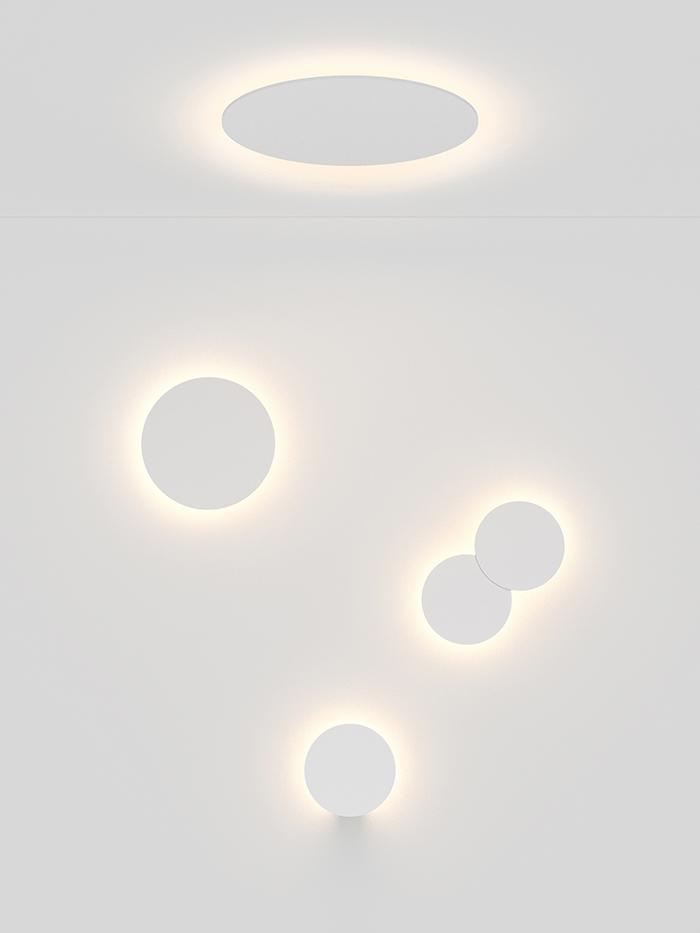 Entièrement en aluminium, Collide Rotaliana présente une émission de lumière indirecte et peut être utilisée aussi bien au plafond que sur le mur. Sa forme représente un prolongement naturel des sources lumineuses utilisées: un, deux ou trois circuits LED circulaires à la tension du réseau, 48W 3000K 4500lm CRI 90, Phase dimming.