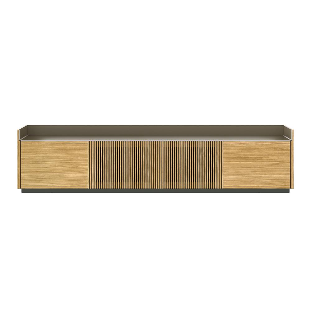 Le positionnement des tiroirs et les grandes portes divisent le buffet de manière raffinée, améliorant la praticité des espaces individuels. L'absence de poignées sur les portes et les tiroirs confirme le choix minimaliste, et l'intégration avec le système de fermeture push-pull renforce son caractère hautement fonctionnel.
